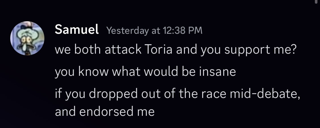 This begs the point to be brought up, that during the debate, candidate Toria brought up that Rat was also an admin and could use it to his advantage, to which Rat responded, “I have never done that, and I would never do that, especially in an elected position.”