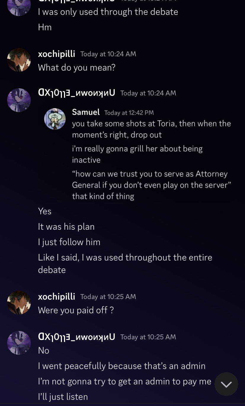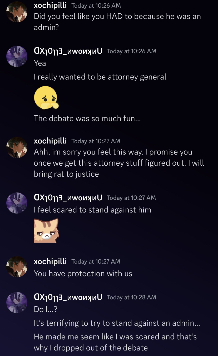 Yesterday Lorecraft held a debate to hear from our candidates for Attorney General for the people to learn more about each of the candidates to make an educated decision based on responses to questions based on the duties of the Attorney General. At the end of this debate the candidate Unknown_Err0rXD dropped out of the election and publicly declared her endorsement for Ratat0ing. This shocking revelation caused some suspicion, and upon further investigation, it was found that Ratat0ing, commonly referred to as ‘Rat’, had previously spoken to Unknown, and planned for her to do this, along with wanting Unknown to attack fellow candidate, Toria, as well.